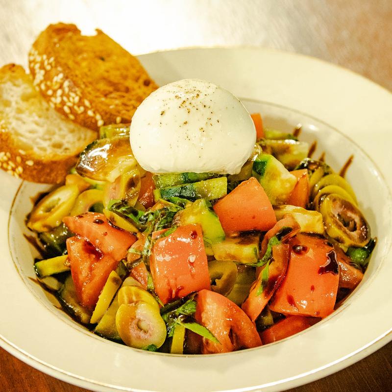 Toasted eggplant, bruschetta tomatoes, EVOO, basil, tomato sauce, and fresh mozzarella.